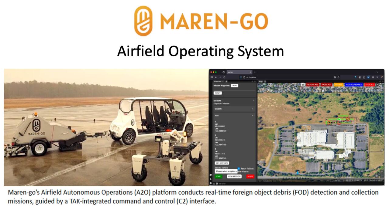 Benefits: Maren-go Airfield OS replaces manual, time-consuming FOD walks and perimeter patrols with autonomous, data-driven operations. The C2 unifies control of all automated missions and manages deconfliction. The same hardware is used for multiple missions.