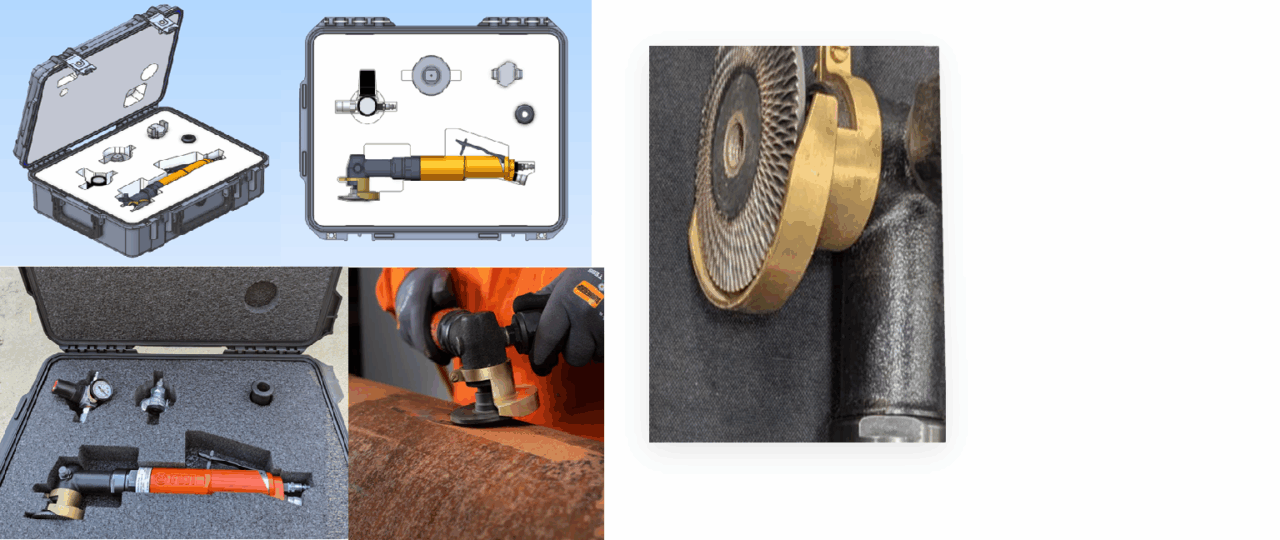 Originally called “sparkless grinder” because of its ability to perform grinding applications, but without the introduction of sparks, removing the need for hot work requirements. The tool has since been rebranded as “cold milling” to get away from the word “grinder” which indicates hot work in its name.