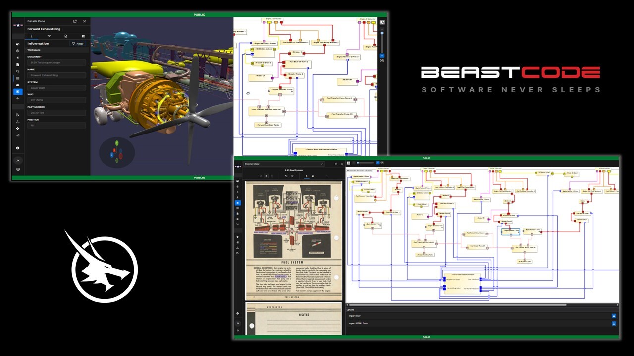 Beast Core’s immersive 3D environments for physical systems are designed to be compatible with government-furnished equipment. Beast Core can digitally convert an organization’s data (i.e., traditional print materials, PDFs, and 2D technical documentation) and transform it into a 3D digital twin, integrating seamlessly with other applications through open architecture. This lightweight representation is easily distributed to end users who are connected with existing logistics systems. Utilizing AI, Beast Core makes documents searchable, parsing text to create hyperlinks to 3D models. Beast Core also integrates with various commercial products, including PLM and MBSE solutions, predictive analytics, AI, and IoT software suites, providing users with real-time updates through a comprehensive digital technology ecosystem.