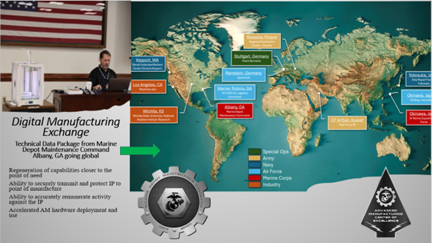 Solution: The Digital Manufacturing Exchange (DMX)—led by Marine Depot Maintenance Command (MDMC) under the Advanced Manufacturing Competitive Advantage Pathfinder (AM/CAP)—is the Department’s only accredited digital backbone for transmitting TDPs and IP-protected manufacturing data to support maintenance and sustainment. DMX enables point-of-need production by livestreaming OEM-controlled design data directly to distributed 3D printers and other manufacturing assets, even when units operate without enterprise network connectivity. Its secure architecture protects IP through encryption and access control while incorporating a built-in remuneration model—similar to purchasing music online—so every OEM use is tracked and compensated. DMX integrates with existing Service repositories, creating a trusted ecosystem where industry, DoD, and allied partners can collaborate without sacrificing security or IP rights.