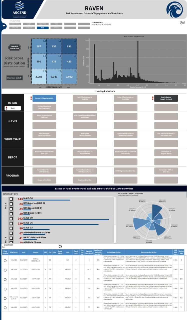 Description- RAVEN (Risk Assessment for Naval Engagement and Readiness) transforms siloed sustainment data into precise, actionable intelligence. Designed with a wartime mindset, RAVEN enables teams to anticipate and act instead of just reacting. The tool ingests the last 30 months of requisition and maintenance data, rapidly analyzes more than 7 million repairable and consumable NIINs, and applies risk scores based on two critical factors: impact on readiness and likelihood (frequency). This produces a TMS-centric risk model grounded in industry-accepted frameworks. Users view results of inaction and receive prescriptive analytics that focus resources on the most urgent, high-impact issues. RAVEN generates step-by-step action plans tailored to each user—retail supply, I-level maintenance, wholesale, COMFRC, and PMAs. These plans reflect logic developed by government and industry SMEs based on technical publications, ensuring operational relevance and effectiveness across all mission phases.