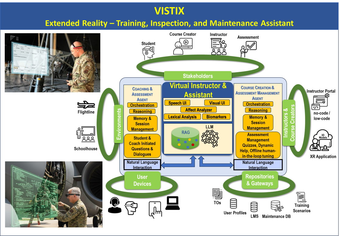 Both prototypes demonstrate the power of voice-first interaction with technical content, freeing personnel from the need to use screens and paper while improving efficiency and accuracy. Unlike current XR systems that rely solely on visual or gesture inputs, VISTIX introduces natural voice interaction in noisy flight-line environments and affect-aware feedback to track trainee stress and confidence, enabling adaptive coaching and reliable assessment.