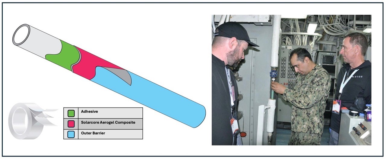 Current chill water pipe lagging is bulky and takes up valuable space on ships as well as a cumbersome installation process. Solarcore’s materials provide improved thermal efficiency which equates to less use of energy to maintain proper temperatures, space savings from a thinner solution, and easy installation. Characterization data for the aerogel material shows performance gains with a lower profile than existing products and can be installed simply in a matter of seconds for readiness and repairs. Participation at previous Navy repair technology exercises allowed for the demonstration of this product.