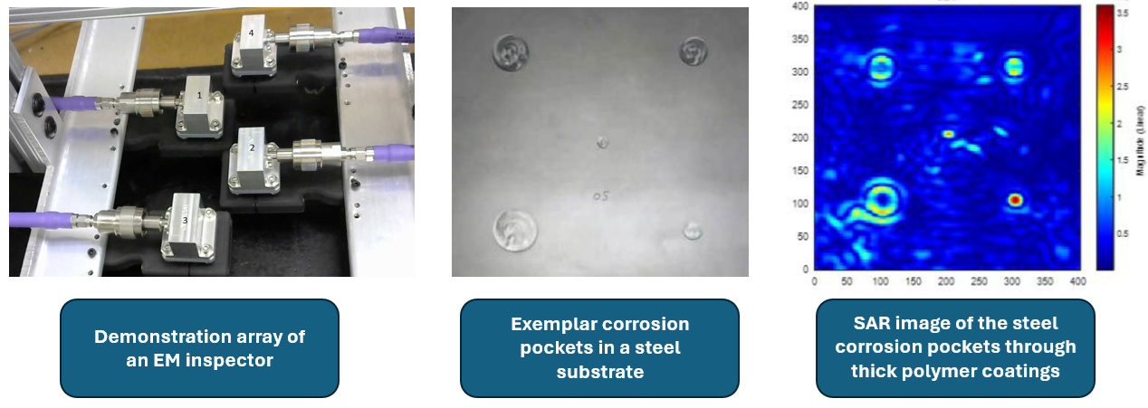Innovative Solution: Electromagnetic (micro/millimeter wave) imagers offer the ability to inspect through different materials in the high MHz to low GHz frequency range, including thick polymer coatings and build images of the substrate surface, including signs of corrosion and other defects. The inspection system uses synthetic aperture radar (SAR) produced by multiple custom designed antennas operating exclusively as transmitters or receivers with low noise amplification to form an overall inspection array. Corrosion patches have been successfully identified underneath polymer layers using this system on steel substrates of interest. Previous iterations of microwave/millimeter wave imagers such as these have been packaged and delivered to customers.
