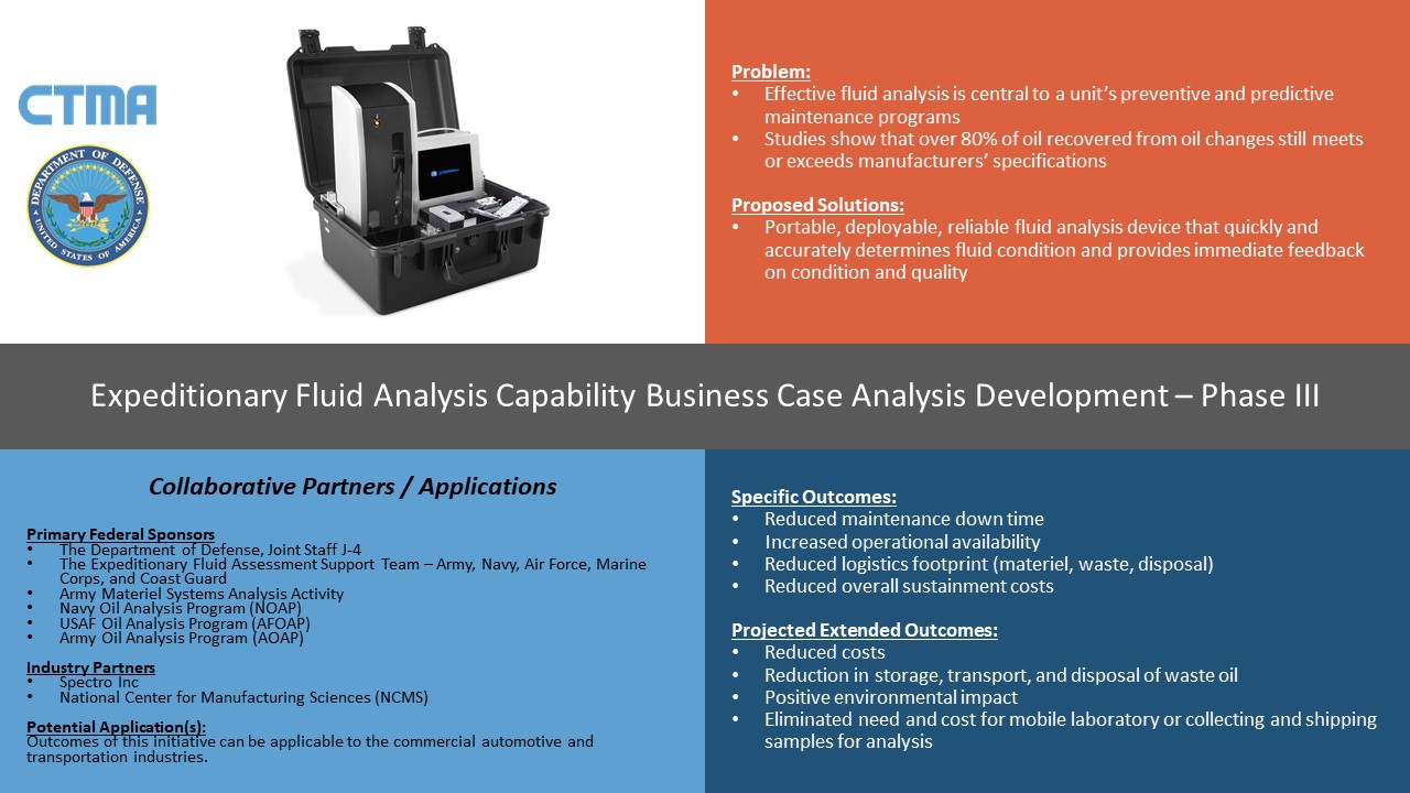 Problem: The Expeditionary Fluid Analysis Capability (EFAC) offers participants a portable fluid testing and diagnostic tool that provides maintenance personnel with real-time assessments of equipment fluid condition. It quickly indicates pass or fail results along with the identification of contaminants that negatively affect fluid life and efficacy such as water or glycol contamination, or increased soot content. When approved by the evaluating service, the device may also utilize a remote-connect capability to virtually connect maintenance personnel to laboratory technicians and analytical processes at the Point of Maintenance (POM). Additionally, when this capability is approved by the evaluating service, the device has the ability to connect to an information network, either hardwired or wirelessly, to share test results as well as receive analytical support and feedback from traditional oil analysis laboratories. This ability extends laboratory capabilities and feedback directly to the location where fluid-related maintenance decisions are being made enabling a more effective use of time, labor, materials, and other resources at the unit level.