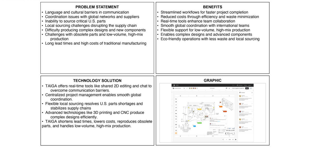 To address diverse industry needs, we developed "Taiga," a digital manufacturing platform designed for efficient production of complex geometries and new components. Taiga excels in challenges like reproducing obsolete parts and handling low-volume, high-mix production, making it a powerful solution for supply chain optimization.