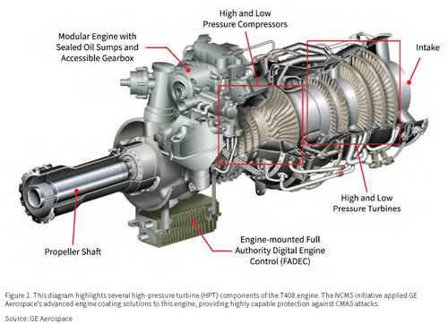 Fortunately, a new class of innovative protectants have been identified. A recent NCMS collaboration with NAVAIR, GE Global Research Center (GRC), and GE Aerospace has tested and validated that several of GE Aerospace’s advanced engine coating solutions offer highly capable protection against CMAS attacks. Through a series of demonstration projects, the collaboration team has evaluated their protective capabilities on the high-pressure turbine (HPT) components of two engines: the T408-GE-400 and the T700-701D. The T408-GE-400 is a turboshaft engine that powers the US Marine Corps’ Sikorsky CH-53K King Stallion heavy-lift helicopter. The T700-701D engine powers both the newest Sikorsky UH-60M Black Hawk and Boeing AH-64E helicopters. Having achieved excellent results during the projects, these coating solutions are currently being applied to the F414 engine of the F-18 aircraft for field testing. This will be the first platform to fly with these coatings, and a field service evaluation will be performed to provide a better understanding of the coatings’ benefits. These coatings are applicable for any aircraft operating in austere sand and/or dust environments. They will provide great potential benefits for the commercial airline industry, along with other industries utilizing aircraft.