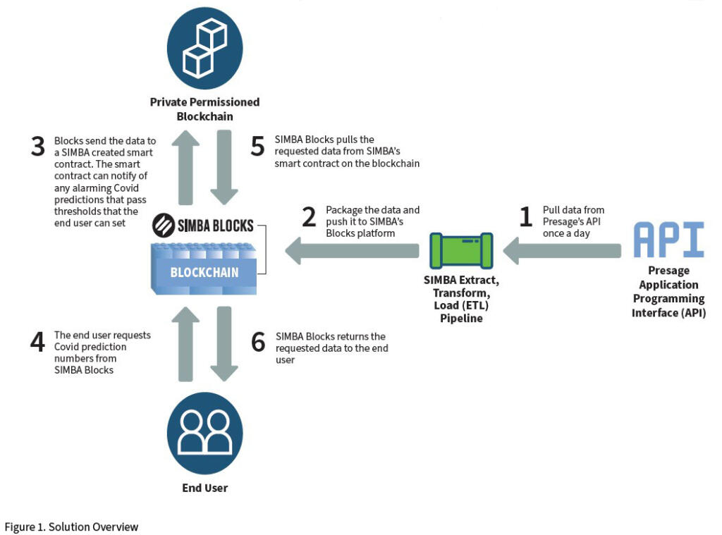 How does this technology work? First, SIMBA Chain pulls data from Presage’s API once a day. Next, the data is fed into the SIMBA Extract, Transform, Load (ETL) Pipeline—a process that packages the data and pushes it to SIMBA’s Blocks platform. Then, Blocks sends the data to a SIMBA-created smart contract, which notifies the end-user of any alarming COVID-19 predictions that pass thresholds set by the end-user.